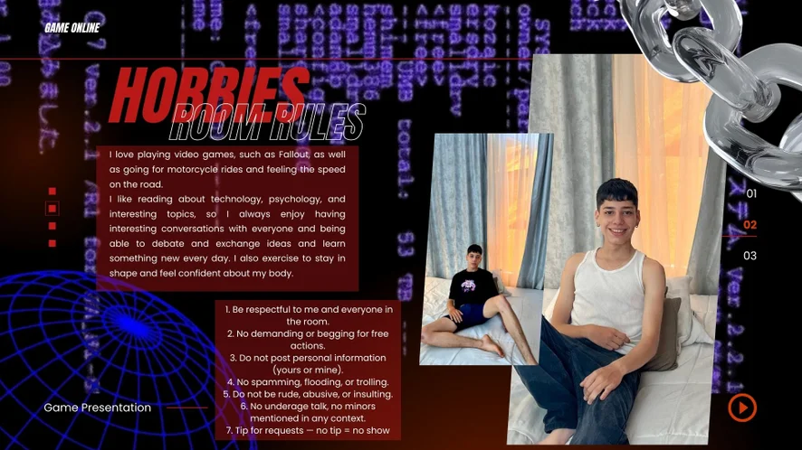 I'm 18 and from Colombia. Smart, playful, and full of good energy. I enjoy fun conversations, jokes, and meeting new people. I can be a little shy at first, but once I feel comfortable, I love to chat and share laughs. If you like positive vibes and spending good and hot time with good company, you’ll enjoy being here